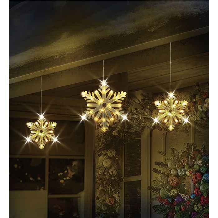 • 175 Twinkling Warm White LED Lights • 6" X 7" & 8" X 9" Alternating Poly Encapsulated Snowflakes • Continuous-on Technology • Connect Up To 15 Sets • 12" Spacing • 9' Lighted Length - 10' Total Length
