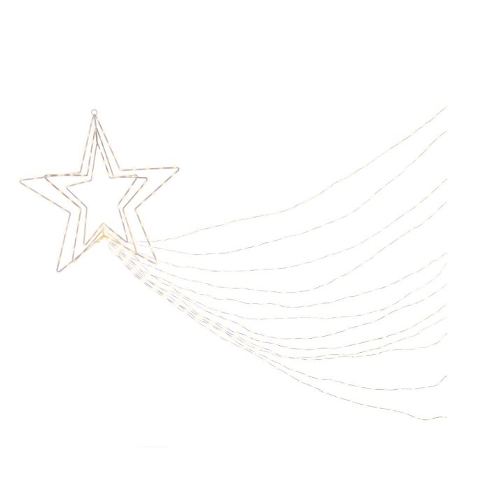 3D (3 star) Cascade Light Shooting Star - Micro light (WW with 25% twinkle), 22.8"/18.9''/15'' rotatable star + 12 drops. Light Strands: 16 strings each 36 in. long. Design: Strings fall from ring at top. Number of lights: 564. Light Color: Warm White Twinkle. Bulb Type: LED lights. Bulb Spacing: 2 in. spacing between bulbs.
