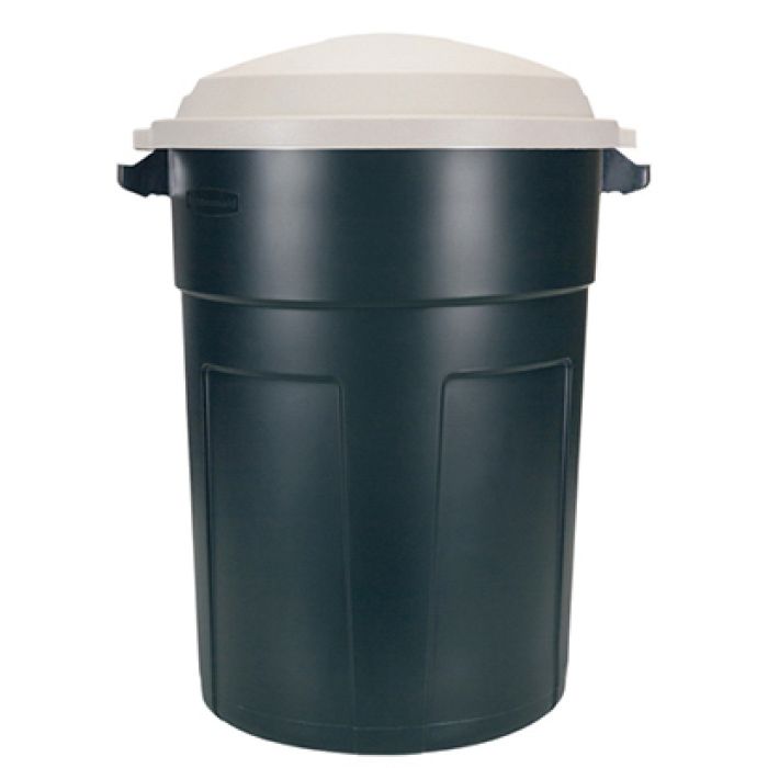 Rubbermaid Roughneck 32 Gallon Evergreen Plastic Refuse Trash Can With snap-fit Dark Platinum lid. This trash can has a bag cinch that holds the can liner bag in place so it will not collapse into the can. A lid tether allows you to attach the lid to the base of the can. The improved durability of the base allows you to drag the can further. It is easy to clean and comes with a full 6-year warranty. This trash can uses Lawn & Leaf Size Plastic Liners.