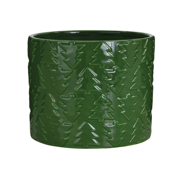 Round 6.5" Opening x 6" H x 7" W ceramic pot embossed with Christmas trees