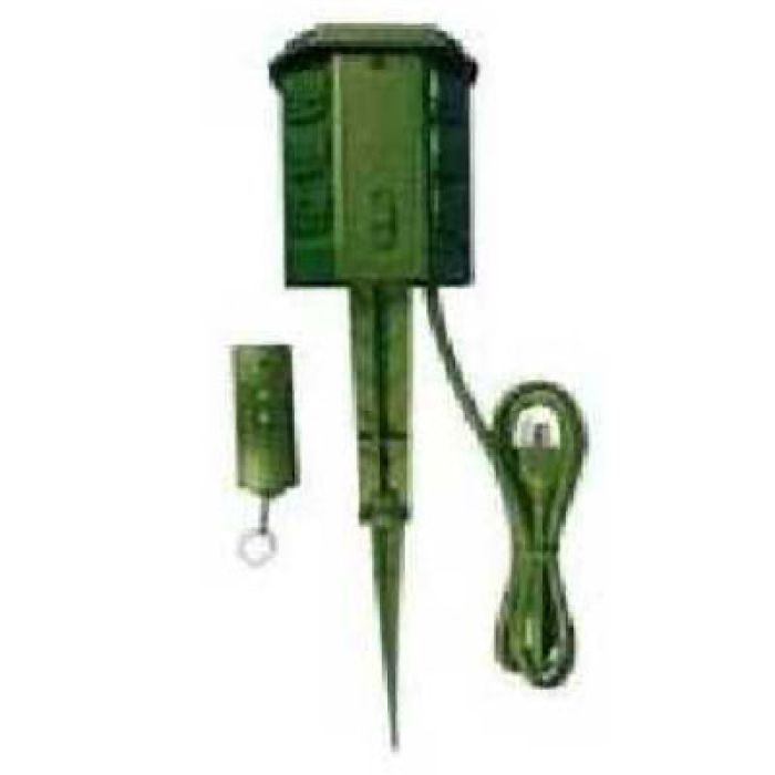 Master Electrician; Green; 6 Outlet Stake; With Remote Control; Side Entry Design With 3 Outlets On Each Side; 12 " Ground Stake; Circuit Breaker Protection; Switch Yard Stake On/Off By Remote Control; Radio Frequency Remote Control Range Up To 100'; 6'; 14 Gauge Grounded Cord For Outdoor Use; UL/CUL Listed.