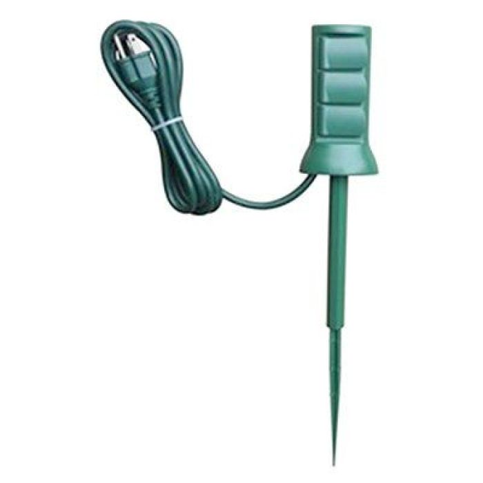 Master Electrician, green, power stake, with 3 outlet grounded outdoor yard stake, 6', 16 gauge grounded cord, handle for overhead hanging, lighted circuit breaker with waterproof rubber cover, sliding covers for each outlet, 6" ground stake.