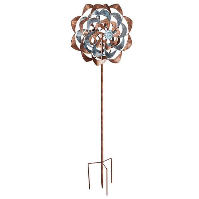 Dual spinning blades for captivating, multidirectional motion. Hand-painted metallic finish in shimmering copper and blue. Sturdy three-prong ground stake for secure installation. Weather-resistant construction for year-round enjoyment.