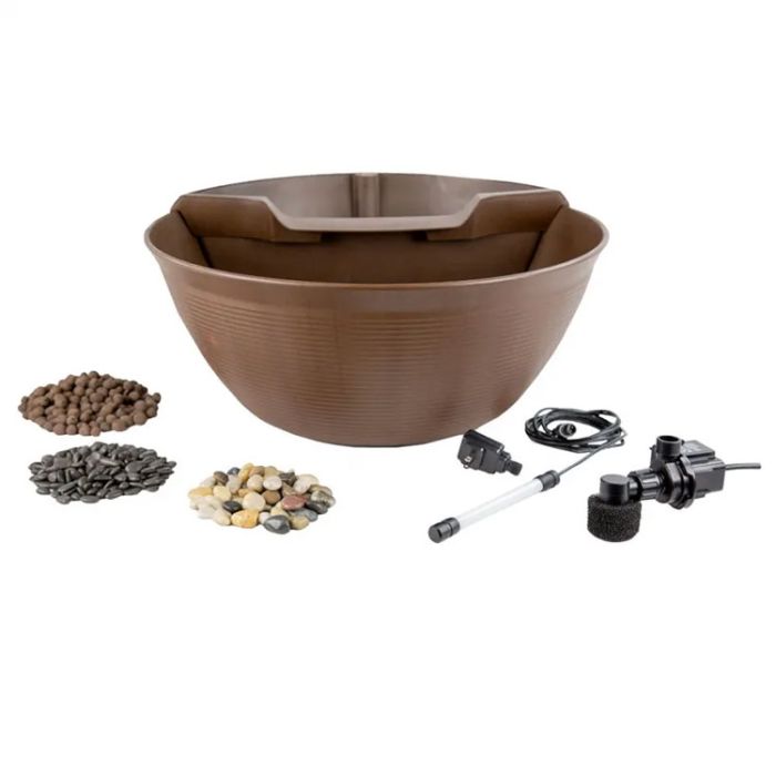 The durable injection-molded construction is lightweight, long-lasting, and features a rippled, textured finish. The kit includes all media and substrate needed, including expanded clay grow/biological media and decorative gravel for both the waterfall and pond. The container measures 23.5″ in diameter and 9 7/8″ tall.