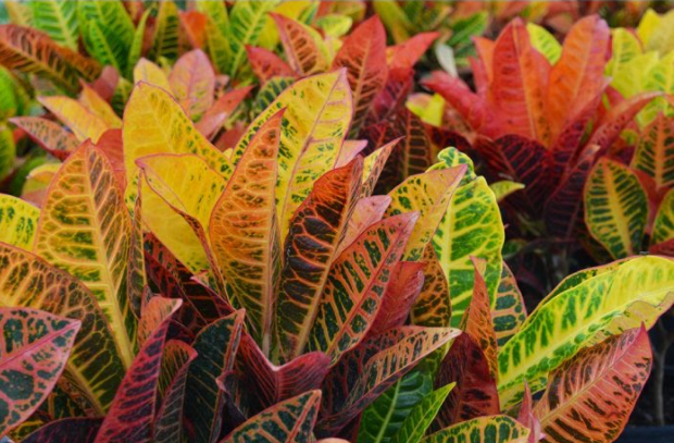 Crotons have variegated leaves with shades of yellow, red, and green. They were originally found in Indonesia. As a tropical plant, they can do well in the warm climates of our homes with the proper care.