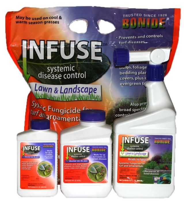 Bonide's Infuse Systemic Disease control is absorbed into the plant, rather than just sitting on the surface. Infuse stops and prevents major diseases on roses, flowers, lawns, trees and shrubs. Cure and prevent Powdery Mildew, Rust, Leaf Spot, Black Spot, Anthracnose, Dollar Spot, Brown Patch and dozens of other diseases! Works for up to four weeks. For lawns, try the granular or hose end versions.