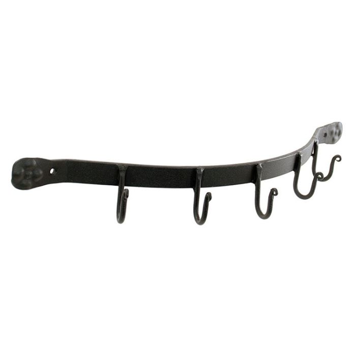 Great for keeping garden tools handy and dry, reducing clutter in the kitchen, basement hall or pantry, for brooms, mugs, kitchen utensils, aprons, shopping bags. With five hanging hooks, and mounting holes 16-in apart, stainless steel screws provided. Measures 3-in H x 20-in W, projects 5-in from the wall. Made of wrought iron with traditional forging techniques, the narrow hooks have curled tips, flower detail. For indoor and outdoor use, Black powder coated for weather resistance.