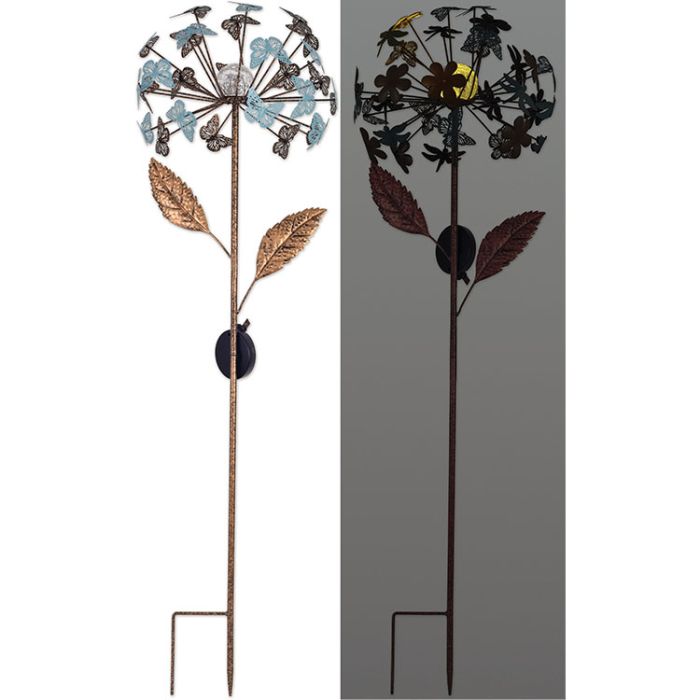 The Butterfly Blossom Solar Stake features a beautiful blossom of butterflies busting out from a center solar ball clear crackle-glass globe that glows at night. The stylish flower shimmers in tones of copper, bronze & gold while the butterflies contrast with light blues, browns with gold specs. For best results, allow for at least 8 hours of direct sunlight each day. Best practice to store indoors during extreme weather. Handcrafted & detailed. Features dusk to dawn sensor. Includes, two-4” ground stabilizing peg. Battery: AAA Ni-MH, 1.2V, 300 mA Great Gift for any gardener! Measures approximately: 12.5 x 12.5 x 41.7"