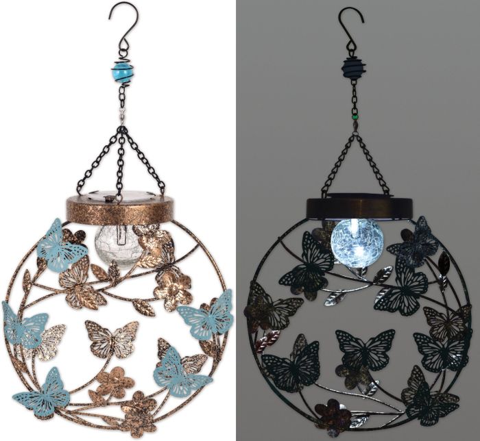 The Butterfly Botanical Solar Hanging Buddy features a beautiful blossom of butterflies busting out from a center solar ball, a clear crackle-glass globe that glows at night. The butterflies are perched on a rustic vine, surrounding the crackle-glass globe. The stylish flowers shimmers in tones of copper & bronze while the butterflies contrast with light blues, browns with gold specs. For best results, allow for at least 8 hours of direct sunlight each day. Best practice to store indoors during extreme weather.