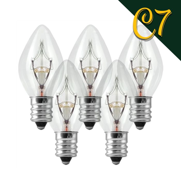 For a natural and old school look to bring back childhood memories, try out the clear and transparent C7 bulbs! These incandescent bulbs are great in any scenario and are sure to brighten up your holidays with its 5 watt, 130 volt bulb to give you over 3,000 hours of life. Also a wonderful addition to a canopy or any other areas you're looking to give a little pizzazz for your party!