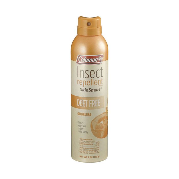 Coleman SkinSmart Deet free insect repellent spray. SkinSmart is made with IR3535, and is inspired by a naturally occurring amino acid. SkinSmart features IR3535 - a CDC recommended alternative to DEET that provides up to 8 hours of protection. Complete protection against mosquitos and ticks. It is lightweight, non-greasy, proven protection. Hold container 6 to 8 inches from skin and spray in a slow sweeping motion evenly over exposed skin.