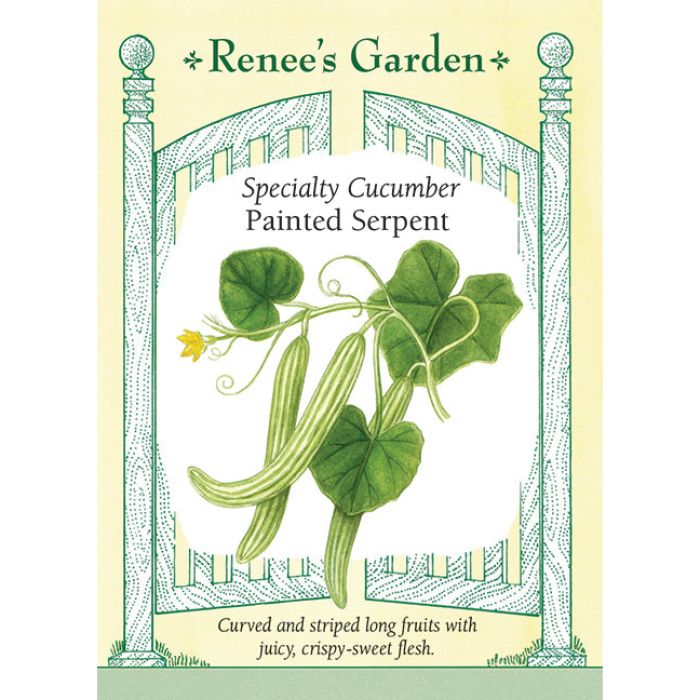 Enjoy long harvests of cool cucumber-like fruits all season! Originally from Armenia, these long, curvy fruits are not a true cucumber but a melon. The crispy, white flesh is never bitter and the pretty striped skins do not need peeling. Painted Serpent thrives in hot and humid weather, yielding consistent large harvests of 10-12 inch long, deliciously juicy fruits to enjoy fresh from the vine. Cut into decorative scalloped slices, they are pretty as a picture!