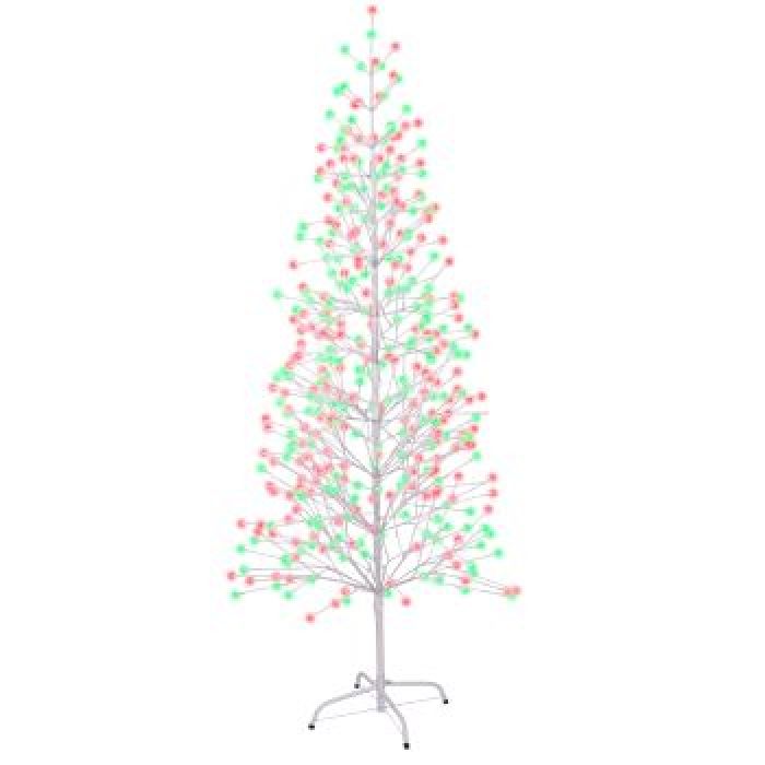Overall height: 6.5 ft. height. Number of Bulbs: 528 5mm LED lights. Bulb Color: Holly Berry (Red/Green) Double Twinkle. Branch Color: Realistic white wood tape. Lead Cord: 10 ft. Usage: Rated for indoor/outdoor use.