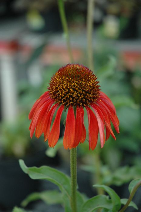 Shuttle-cock type of coneflower with fiery red-orange bicolor flowers and dark center cone; fragrant flowers great for flower arrangements, attracts pollinators and feeds the birds at winter; use in naturalized areas