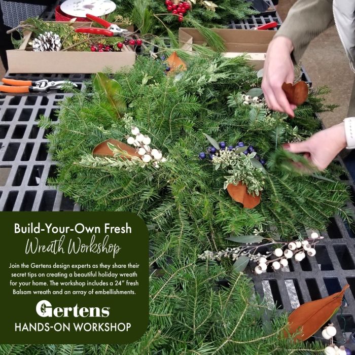 Gather your friends, family or coworkers for a fun, creative fresh wreath decorating workshop. Join the Gertens design experts as they share their secret tips on creating a beautiful holiday wreath for your home. Enjoy festive treats as you create. The workshop includes a 24” fresh Balsam wreath and an array of pre-selected embellishments. Additional accents may be purchased separately. We appreciate no outside materials brought in, as our menu has plenty to choose from.