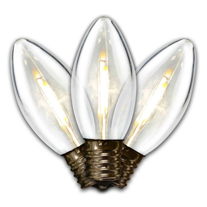 The Incandescent Bulb look and color but with LED technology, it's time to switch to a more efficient energy saving bulb. LED C9 Transparent FILAMENT Pure White bulbs are a perfect match. LED Bulbs are designed to be virtually unbreakable so you can illuminate your home with a soft glow of light and holiday cheer in a worry free installation process. LED C9 FILAMENT Pure White bulbs are designed to line the roof or wrap outdoor trees with these large bulbs to create a modern holiday display with a nod of tradition.