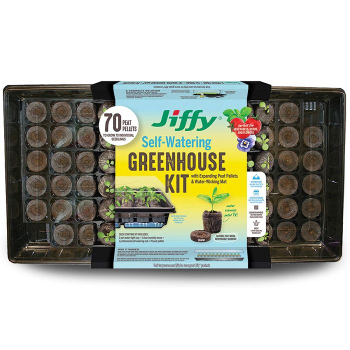 Jiffy® Self-Watering Greenhouse Kit 70 36mm Cells & Pellets, Water-Wicking Mat, Tray & Dome