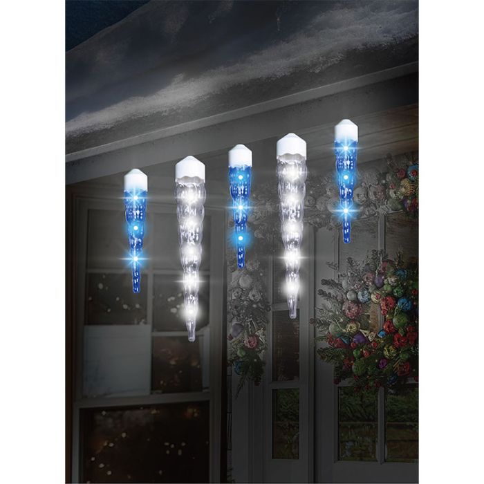 • 64 Twinkling Blue & Pure White LED Lights • 7" & 11" Alternating Poly Encapsulated Icicles • Continuous-on Technology • 12" Spacing •15' Lighted Length - 16' Total Length • Connect Up To 30 Sets