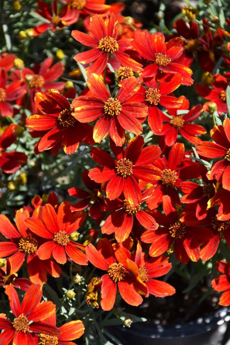 A neat, mounded variety, covered with stunning, daisy-like scarlet flowers with splashes of yellow; tolerant of pests and drier soils; thriving in sandy and rocky soils; great as edging, or in containers; needs good drainage
