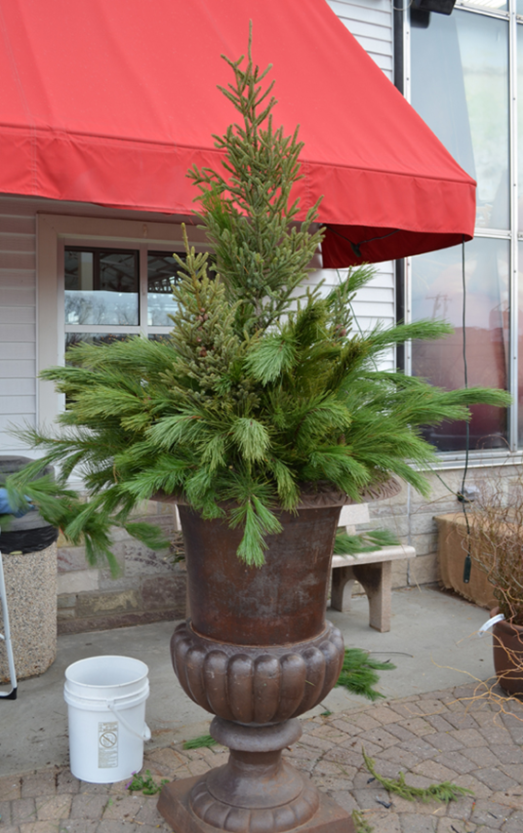 Continue to add Pine and Spruce all the way around the pot 360 degrees to maintain a full look at any angle.