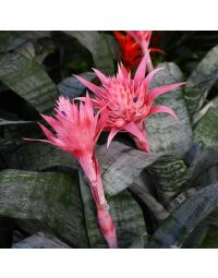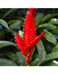 Bromeliads are brightly colored tropical plants commonly grown as houseplants. There are many different types, from the Spanish moss that grows on trees to the pineapples that we get from the grocery store. The types usually grown as houseplants are: Vriesea, Guzmania, and Aechmea. They have leaves that form cups to hold water, brightly colored centers and can grow to be fairly large houseplants.