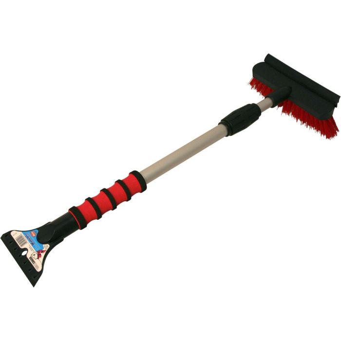Twist locking steel pole extends from 23 to 36 inches. Has ample reach when fully extended, and when collapsed is compact for easy storage in vehicle. 7" wide brush head pushes away heavy snow and squeegee clears frost. Ice scraper breaks through and clears tough ice. Foam grip handle for comfort.