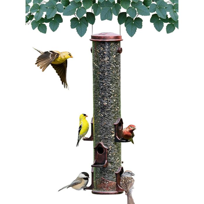 This Tube Feeder Measures 23 Inches Tall, the Tube is 4 Inches Across, and the Perches are 6.25 Inches Across. This Dome Top Bird Feeder Holds 10 Cups of Bird Seed or Sunflower Seeds for Birds, which is More than Most Standard Bird Feeders. This Clear Bird Feeder Tube is Made of Sturdy Plastic that is Long Lasting. The Six Metal Feeding Ports on this Bird Feeding Station Hold up to the Weight of Small and Larger Birds. These Bird Feeders for Outside Come Ready to Use. The Copper Metal Roof Lid on this Large Bird Feeder Easily Removes, Making Refilling a Breeze. This Tube Bird Feeder Comes with a Telescoping Metal Hanger which can Hang from Any Standard Bird Feeder Pole. This Bird Feeder Tube Features an Attractive Brushed Copper Color that Matches Any Surroundings. This Metal Bird Feeder is also Great for Winter, Providing a Critical Food Source for Birds when Food is Scarce. For Best Results, Empty this Feeder into a Bucket Every Week to Keep the Seed Fresh and Loose. Proper Care will Keep the Birds Happy and Coming Back. Clean and Dry Your Feeder, then Refill with the Same or Fresh Food.