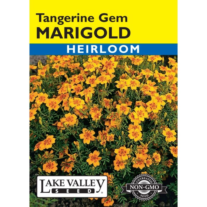Tangerine Gem is a “signet” marigold, noted for its compact shape, delicate single flowers, and finely-cut, lemon scented foliage. In full bloom, the foliage virtually disappears under a canopy of bright orange. Perfect for garden borders.