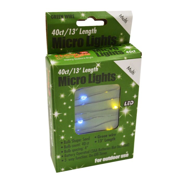 Dimensions: 13 ft. Bulb Color: Multicolor (Red, Yellow, Blue, Green). Bulb Count: 40. Bulb Type: Micro LED. Bulb Spacing: 4 in. Wire Color: Green. Features: Timer. Lead Wire: 11.8 in. Usage: Indoor/Outdoor. Batteries: Requires 3 AA batteries (not included).PROFESSIONAL-GRADE GABRIEL LIGHTS®