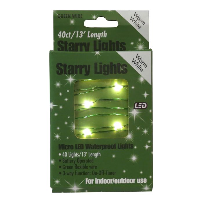 Dimensions: 13 ft. Bulb Color: Warm White. Bulb Count: 40. Bulb Type: Micro LED. Bulb Spacing: 4 in. Wire Color: Green. Features: Timer. Lead Wire: 11.8 in. Usage: Indoor/Outdoor. Case Pack: 24. Batteries: Requires 3 AA batteries (not included).PROFESSIONAL-GRADE GABRIEL LIGHTS®