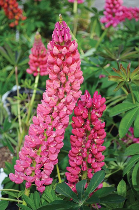 Large stalks of cherry red flowers are held on deep red stems above dark green foliage. Beautiful as an accent or part of a mass planting.