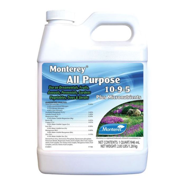 Monterey All Purpose Liquid Fertilizer contains a 10-9-5 analysis with micronutrients to improve growth, blooms, size, and quality of fruits and vegetables.