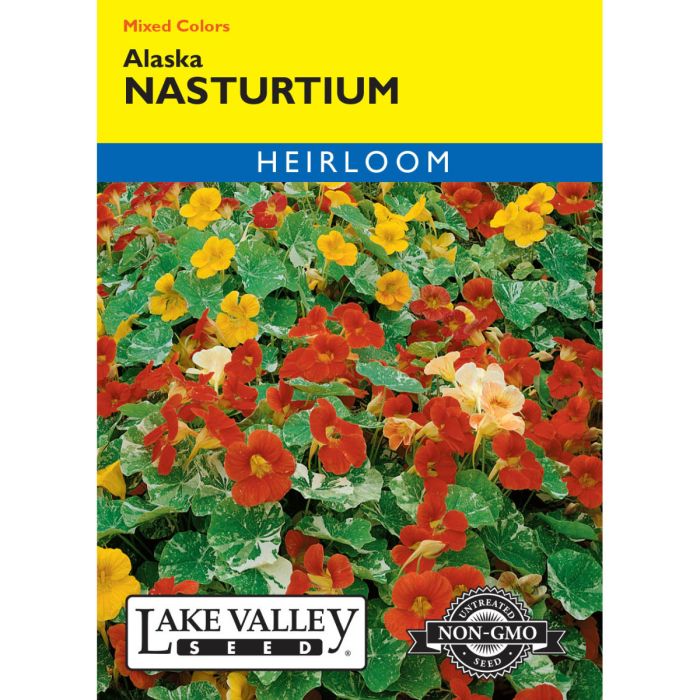 Variegated foliage with splotches of creamy white makes this nasturtium stand apart. Bright flowers in orange, yellow, and red are a peppery addition to summer salads. May stop blooming in summer heat but will rebound in cool weather.