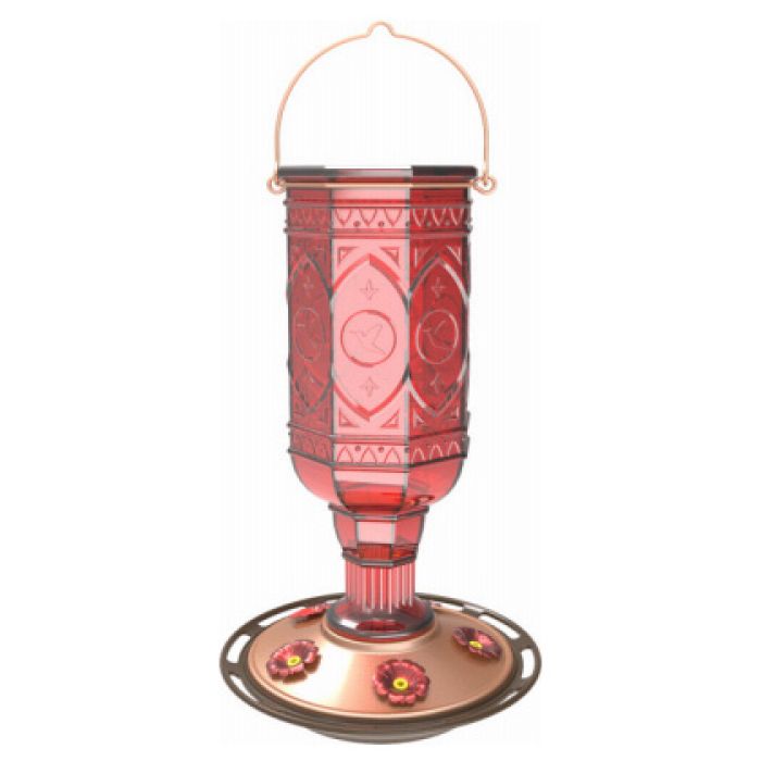 20 oz. Jewel Red Hummingbird Feeder, featuring 5 metal flower feeding ports in polished red and a wrap-around perching space. This stunningly red, vintage 8-sided glass bottle design with elegant hummingbird motifs adds a touch of bygone beauty to your backyard. The wide bottleneck opening and detachable flat base make filling easy and cleaning a breeze. With a 20 ounce nectar capacity, it provides plenty of nectar to keep hummingbirds happy and coming back for more.