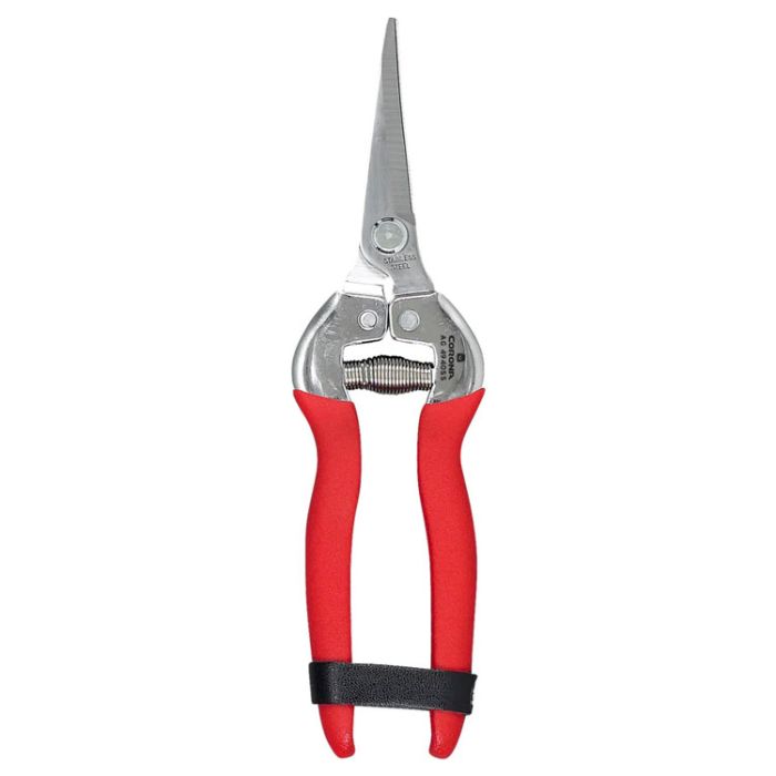 The Corona Long Curved Snip allows you to trim, cut and harvest your plants with precision and care. Specially designed for picking and field-dressing grape bunches, these gardening scissors have a 1 ¾-inch long blade with a fine, curved tip that’s ideal for snipping small stems, flowers, buds, fruits, vegetables and more. Made with corrosion-resistant stainless steel, the blades and pivot are easy to clean and resist germ and residue build-up, helping reduce cross-contamination. Our trimming scissors also feature slim, lightweight grips with an unobtrusive leather strap lock for safe and easy storage. These gardening snips are a must-have tool for making close, accurate cuts in tight areas.