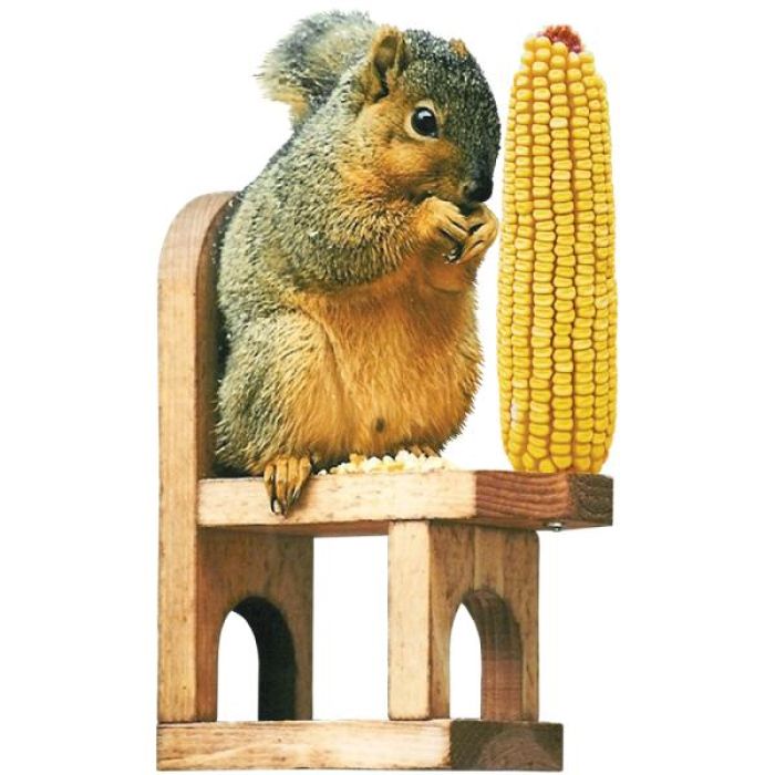 Enjoy the squirrels as they sit in their chair and eat their own ear of corn. Constructed of long lasting Western Red Cedar in our Missouri workshop. 3 inch screw holds the ear of corn.