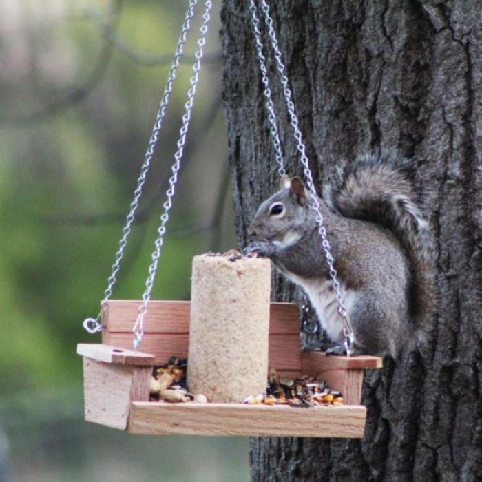 Miniature porch swing. Zinc plated chain. 3 inch screw holds corn. Feed bird seed in base.