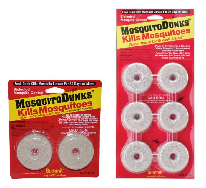 Biological mosquito control. Simply place one in any standing water around your house. They will float on the water and keep working for 30 days under typical environmental conditions. 1 Dunk will treat 25-100 square feet of surface area.