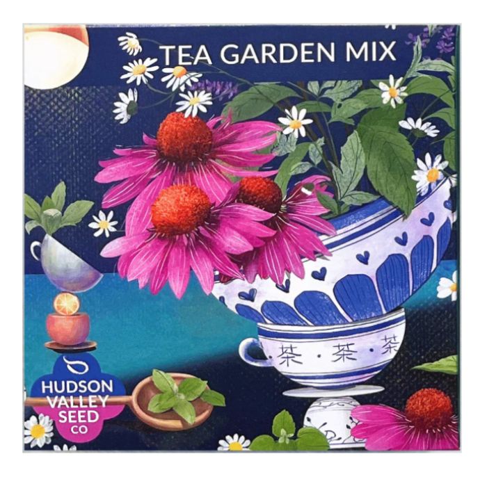 Jiny He's design for the Tea Garden Mix features a signature off-kilter assemblage of vessels and plants, with tipsy teacups alongside flowers and charming cats. Her global background, spanning China, Australia, and the US, deeply inpires her artwork.