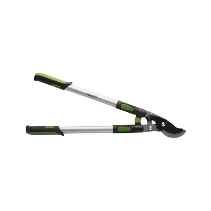 Green thumb, heavy duty, gear driven telescoping bypass lopper, extends: 26" - 36.5", compound action with 1.25" cutting capacity, light weight aluminum handles, soft tpr grips, black powder coated blade, 10 year warranty.