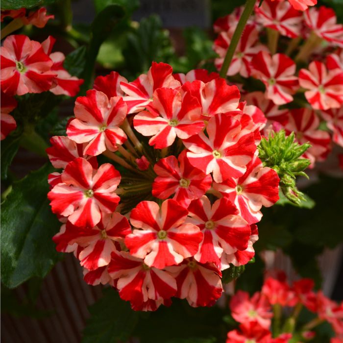 Lanai® Red Star Verbena features showy clusters of red star-shaped flowers with white stripes at the ends of the stems from late spring to mid fall. The flowers are excellent for cutting. Its tiny tomentose narrow leaves remain green in color throughout the season.