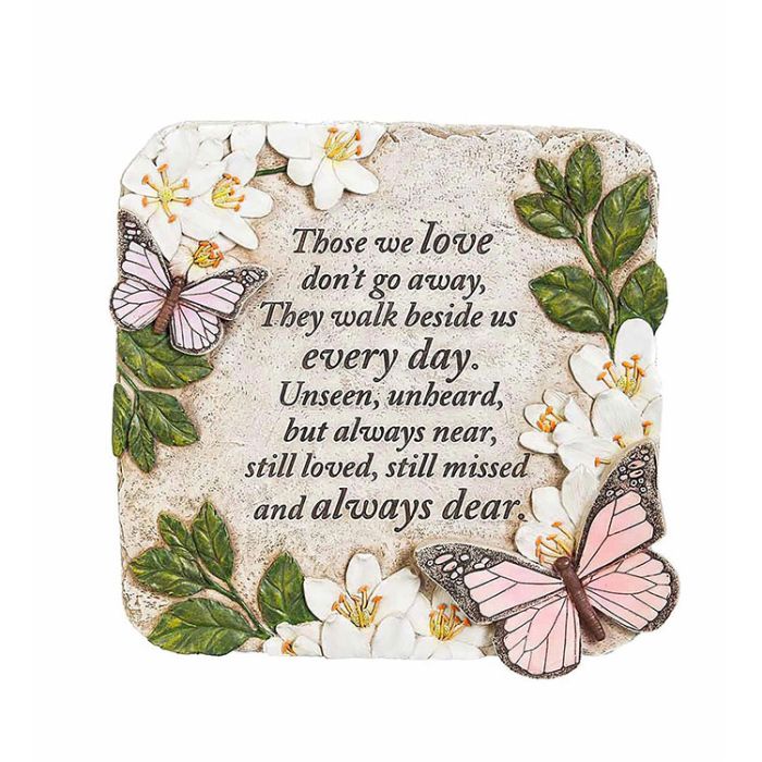 Place this beautifully crafted butterfly-adorned stone in any garden in memory of a loved one. When words do not seem like enough, this stone serves as a touching tribute to honor and commemorate those who have passed. The inscription reads, "Those we love don't go away, they walk beside us every day. Unseen, unheard, but always near, still loved, still missed and always dear." Put the stone alongside a walkway, under your favorite tree, near a flower bed, or on a porch or patio. It can also be easily displayed indoors as well. Made out of polystone resin, it has been treated with a special finish for protection against the sun and weather.