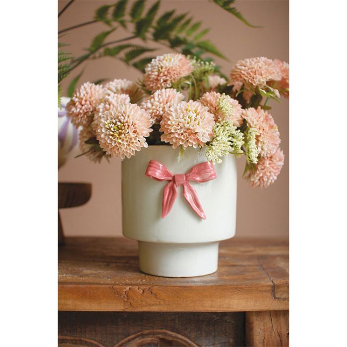This ceramic flower pot with pink bow detail is perfect for a little girl's room or a gift to a new mom. Plop in a potted plant or watch your seeds grow together. It fits anywhere you need a touch of pink.