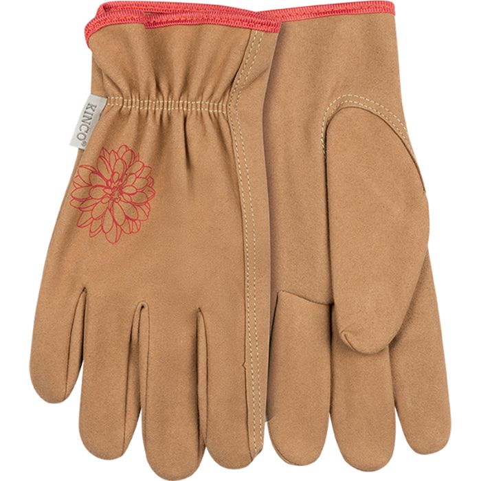 Durable tan MiraXP2™ water-resistant suede synthetic leather with coral floral imprint on back-of-hand provides excellent protection in wet conditions & long-lasting durability, while remaining soft & flexible